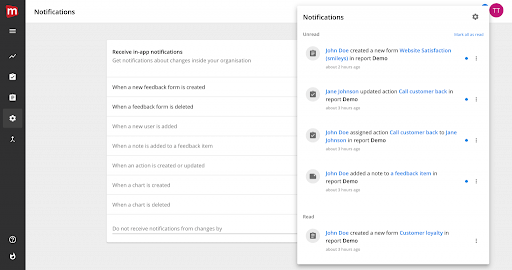 This exciting new feature, in-app notifications, also went live this year. The live event stream informs users about important activities from team members, such as creating new feedback forms, adding notes, editing dashboards, and creating new reports.