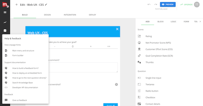 Het grote verschil met de preview voorheen is dat je naast de preview bewerken ook de instellingen direct op de previewpagina aan kunt passen. Je kunt bijvoorbeeld instellen welke feedback button je wilt gebruiken en hoe je het formulier wilt weergeven. Sla deze wijzigingen meteen op, of verlaat de preview zonder het op te slaan.