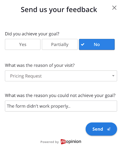 Il est important d’offrir des informations claires et pertinentes à vos visiteurs. Pour évaluer la manière dont vos visiteurs perçoivent ces aspects sur votre site web, vous pouvez recueillir des feedback de différentes manières. Soit en ajoutant un formulaire de feedback intégré à la page, soit en utilisant un formulaire passif, soit en activant un déclencheur proactif lorsqu’un visiteur a fait défiler la page vers le bas.