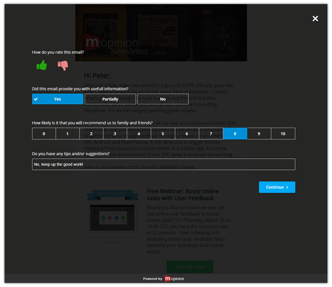 Want to learn more about Mopinion’s all-in-1 user feedback platform? Don’t be shy and take our software for a spin! Do you prefer it a bit more personal? Just book a demo. One of our feedback pro’s will guide you through the software and answer any questions you may have.