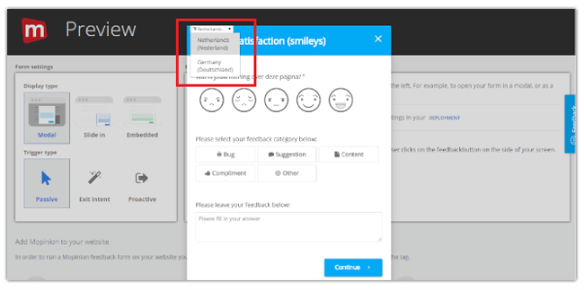 Note: to the right of the language filter, you have the option to manually add a ‘language selection’ option to your feedback form. This enables your visitors to switch back and forth between the different languages your form is available in: