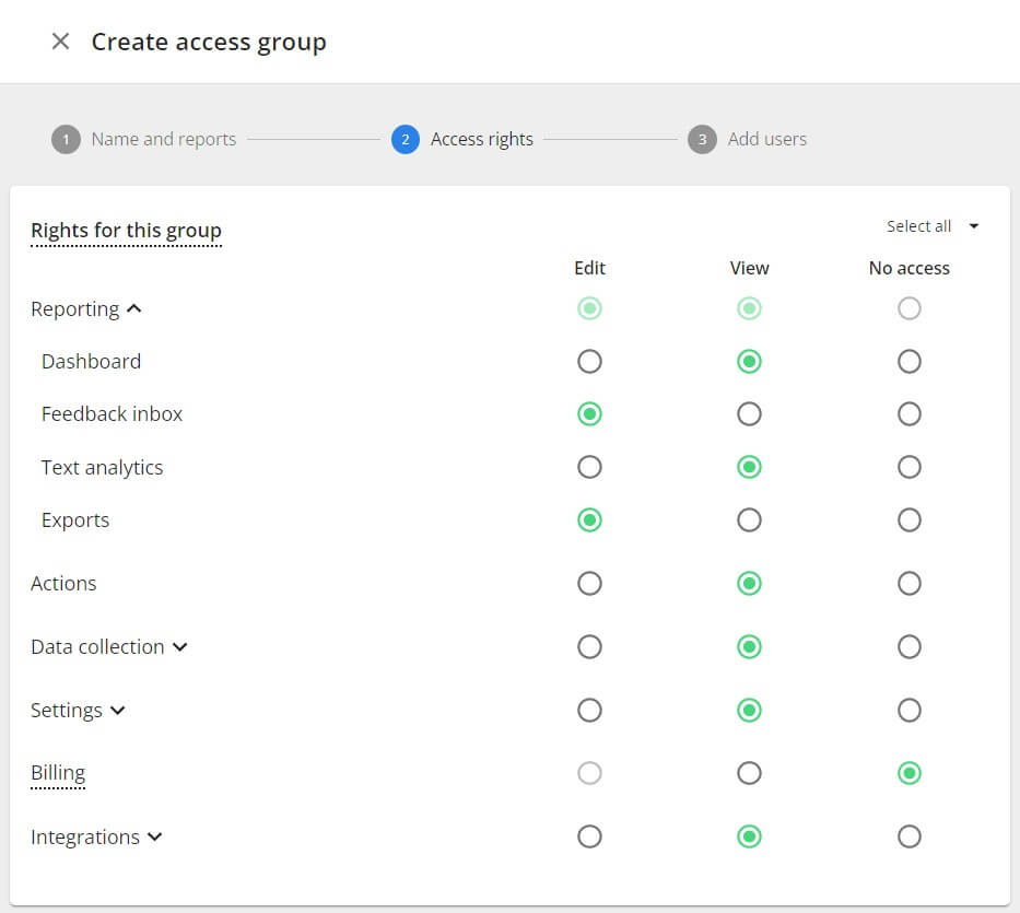 Voor content marketeers kan je hetzelfde doen. Geef ze toegang tot relevante reports en bewerk rechten voor het bouwen van formulieren en het inrichten van het dashboard. Afhankelijk van hun wensen kan je weergave rechten geven tot bijvoorbeeld de feedback inbox. Zo kunnen ze de inkomende feedback wel zien maar geen tags of actions aan feedback items toevoegen.